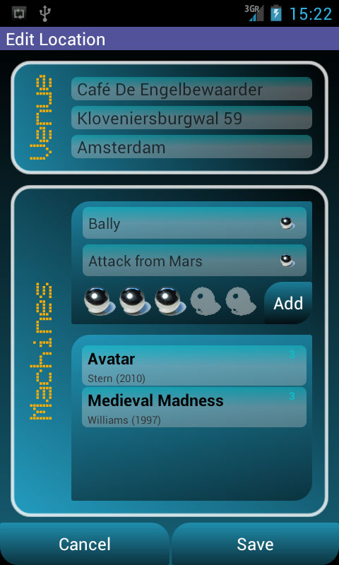 The Pinball Locations app for Android shows you most of the current pinball locations all over the world. A user can add or edit locations to keep the database up to date and can add comments about the locations and the machines. A user can also store his or her personal highscores with the app.